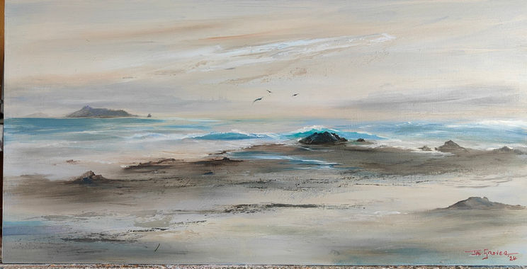 Her passion is to capture the effects of light be it landscape or seascape, using a limited palate to create atmosphere and mood. She uses figures where appropriate to draw the viewer into the scene, allowing the viewer to relate more personally to the environment.